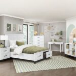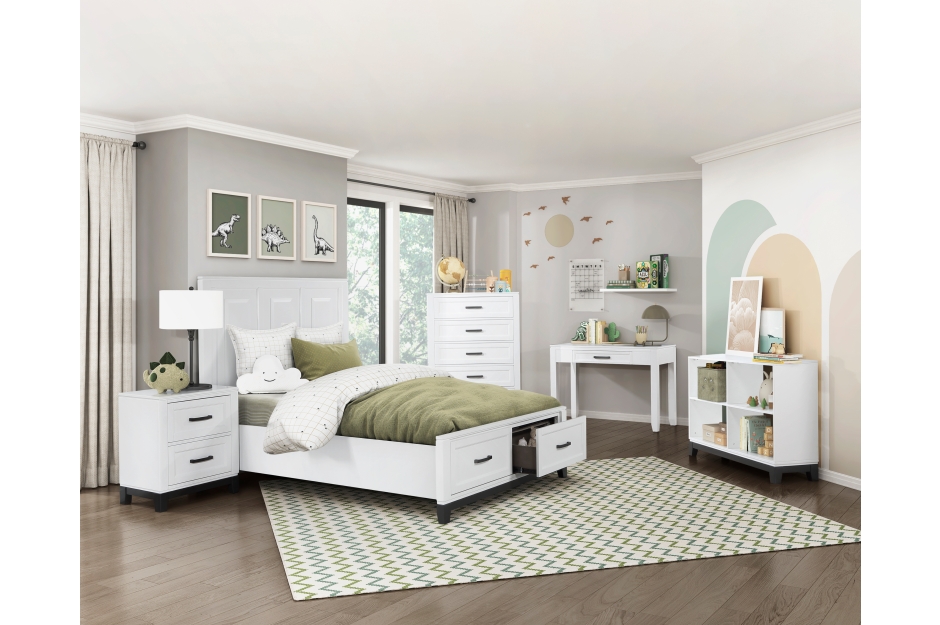 The Garrett Collection blends transitional lines with rustic styling to create an elegant addition for your bedroom. The Full bed features a white finish and metal bar hardware on the picture frame drawer fronts of the low-profile storage footboard, the two drawers creating additional space within your room for soft good storage.