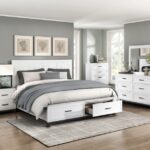 The Garrett Collection blends transitional lines with rustic styling to create an elegant addition for your bedroom. The Eastern King bed features a white finish and metal bar hardware on the picture frame drawer fronts of the low-profile storage footboard, the two drawers creating additional space within your room for soft good storage.