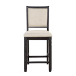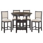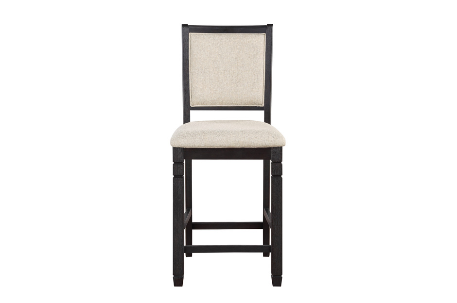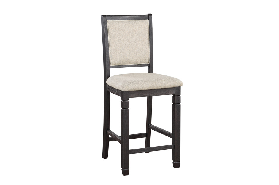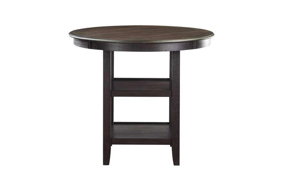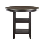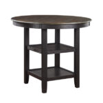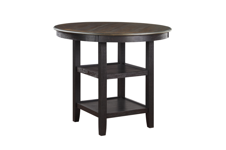 The transitional style of the Ashton Collection creates a versatile platform to inspire your casual dining room décor. The round counter height table’s support base features a display shelf that allows for quick and open access to your tabletop accessories. The brown and black finish over acacia veneer serves to highlight the wood’s grain while allowing for maximum versatility in decorative accenting. The coordinating wood-framed counter height chairs feature beige fabric seats for complementing contrast.