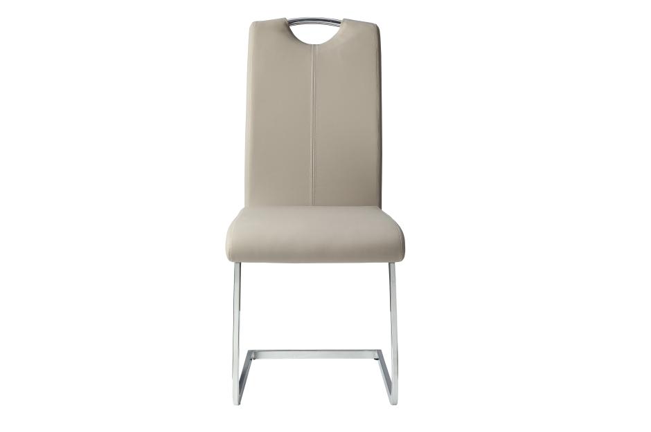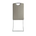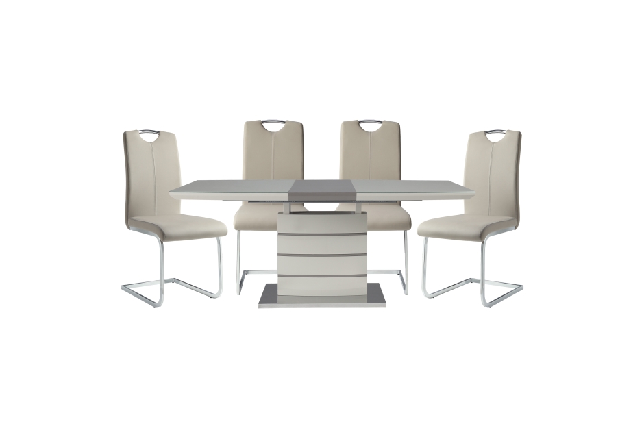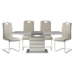 Sleek contemporary styling provides the platform which you will create your casual dining space in the Glenda Collection. Ultra-bright high gloss white and gray-taupe finish is paired on the table top and pedestal base, creating distinct contrast to the high polish chrome base plate. The continuous base of the accenting chairs rises to support gray-taupe faux leather seats with understated vertical stitching and chrome chair top accent providing additional visual interest. A smooth glide system opens with ease to reveal the self-storing butterfly leaf.