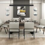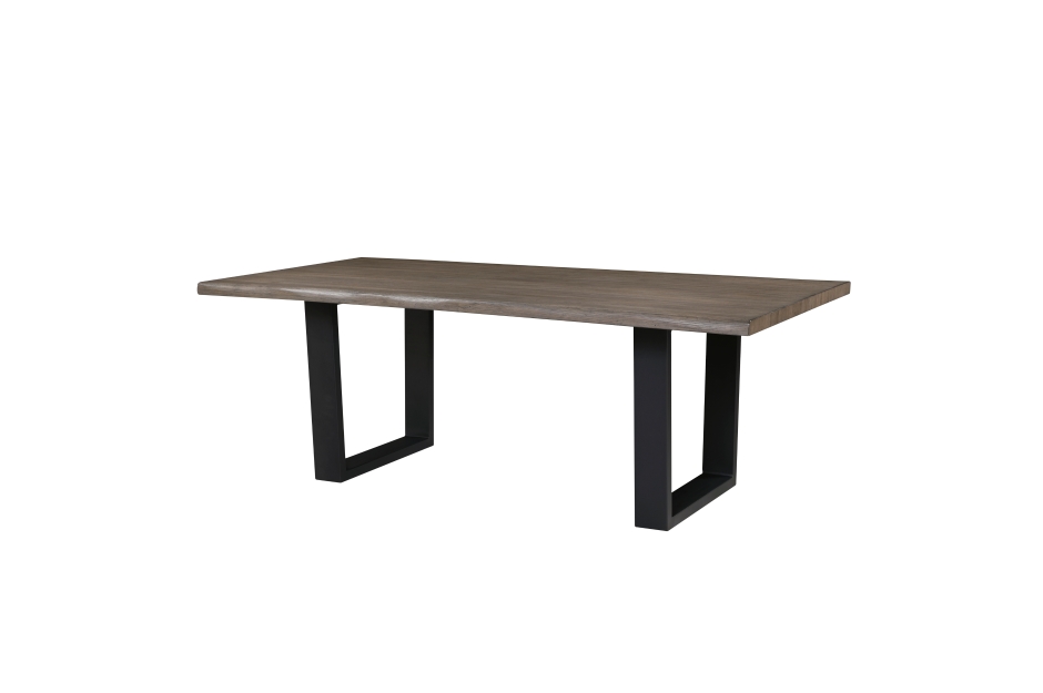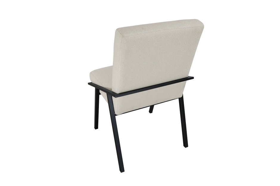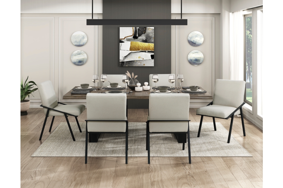 Transform your dining area with the Rochelle Collection, where natural warmth meets contemporary design. At its heart lies the oak veneer dining table, boasting a smooth, natural oak finish tabletop crafted from oak veneer and engineered wood, complemented by a striking black powder-coated metal base. Comfortably seating six, it’s ideal for gatherings and everyday meals. Accompanying the table are the cream textured fabric dining chairs. These chairs feature a sleek black powder-coated metal base with a unique open design, providing both stability and a modern aesthetic. The soft textured fabric upholstery in a neutral cream hue, coupled with a padded seat and back, ensures exceptional comfort. The Rochelle Collection seamlessly blends rustic charm with modern sophistication, creating an inviting and stylish dining experience.   TABLE: 42 x 84 x 30.5H