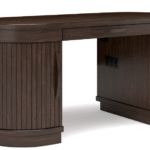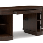 The Korey home office desk is perfectly modern in every way. Finished on both sides in a rich wood tone, it can be floated in a room or used as a divider. Two half round door cabinets, each with an adjustable shelf, deliver a well-organized space for work-from-home professionals. It’s a striking study in upscale contemporary form and function.